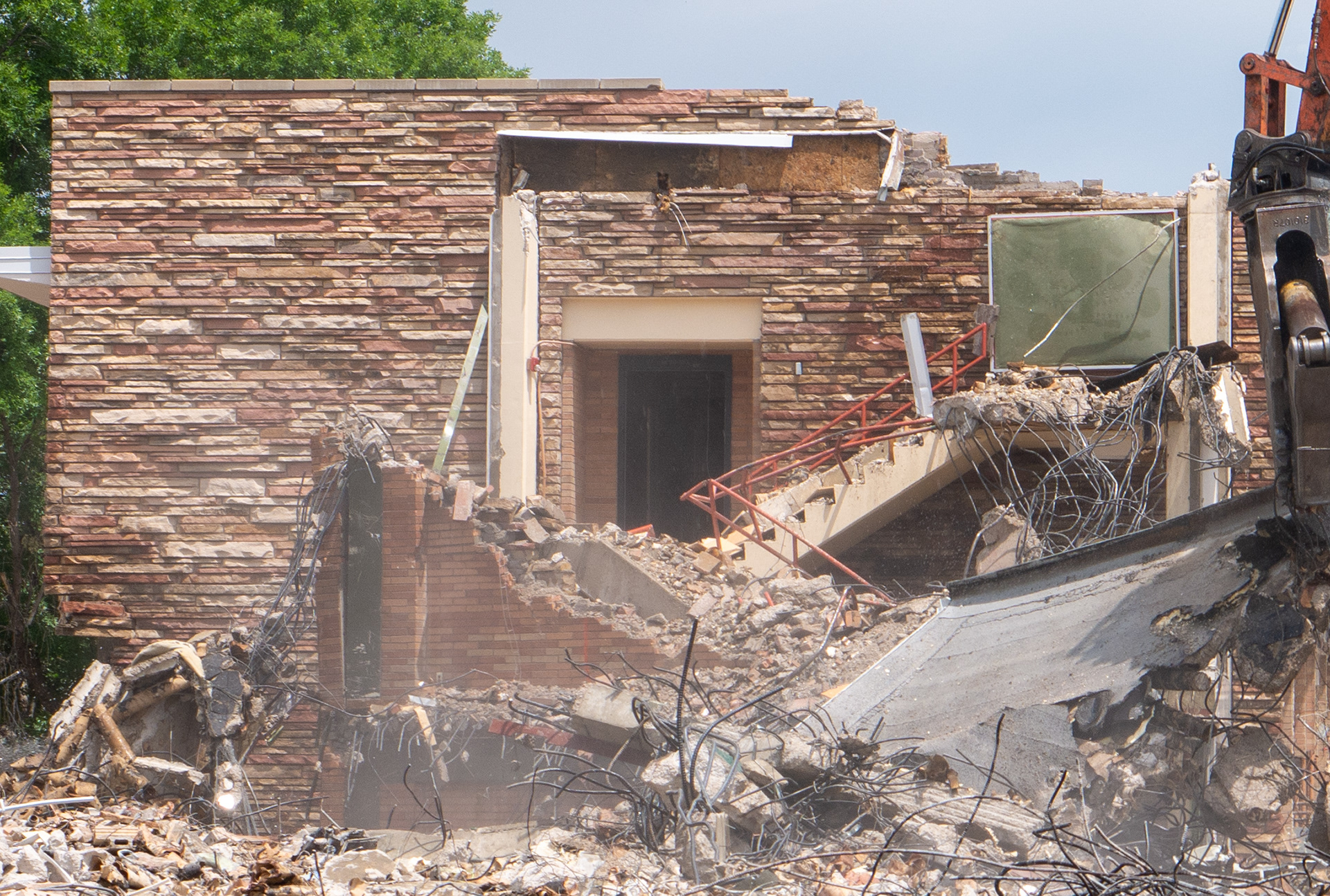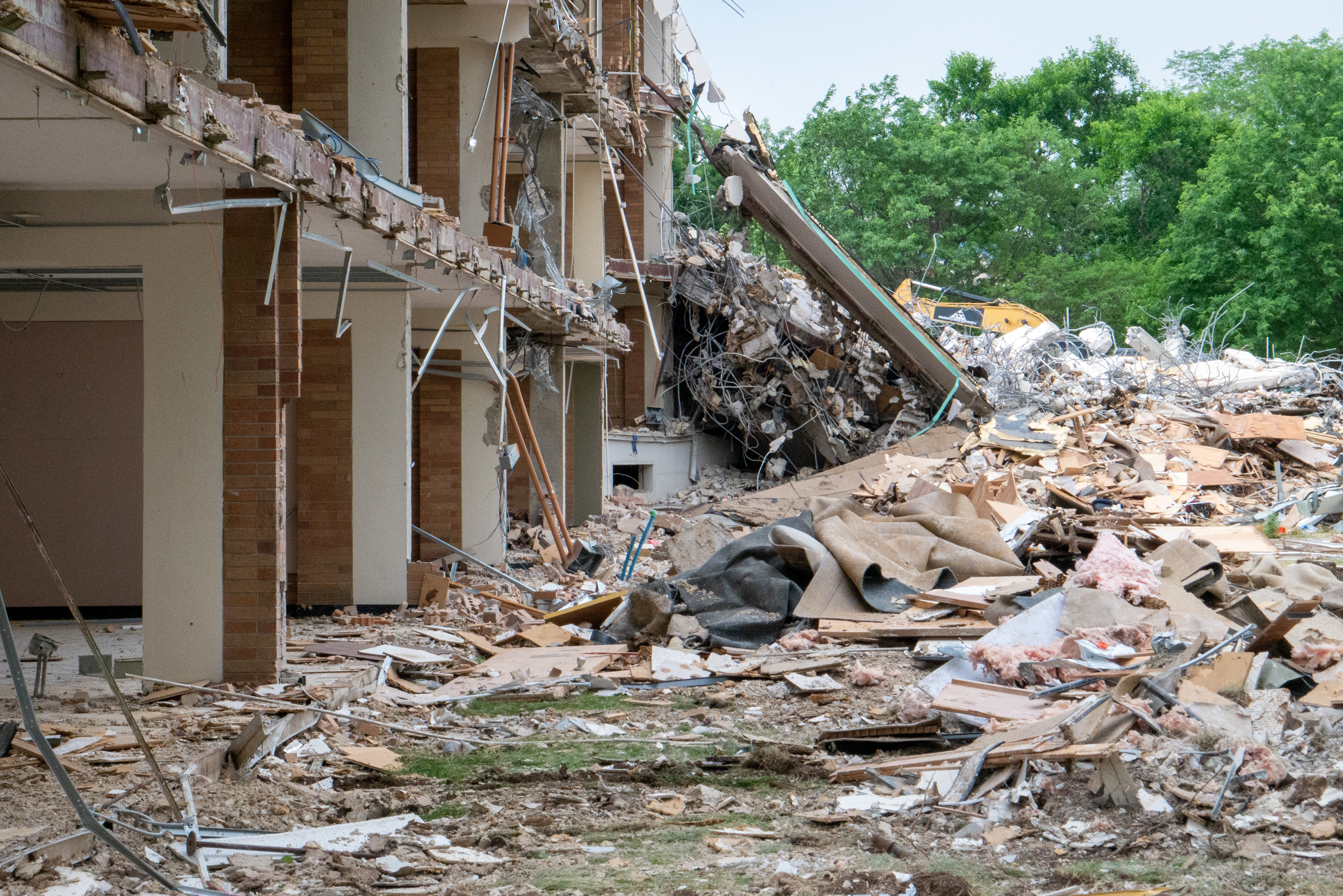 Piles of office debris and carpet hanging from the NE wing, south-facing side