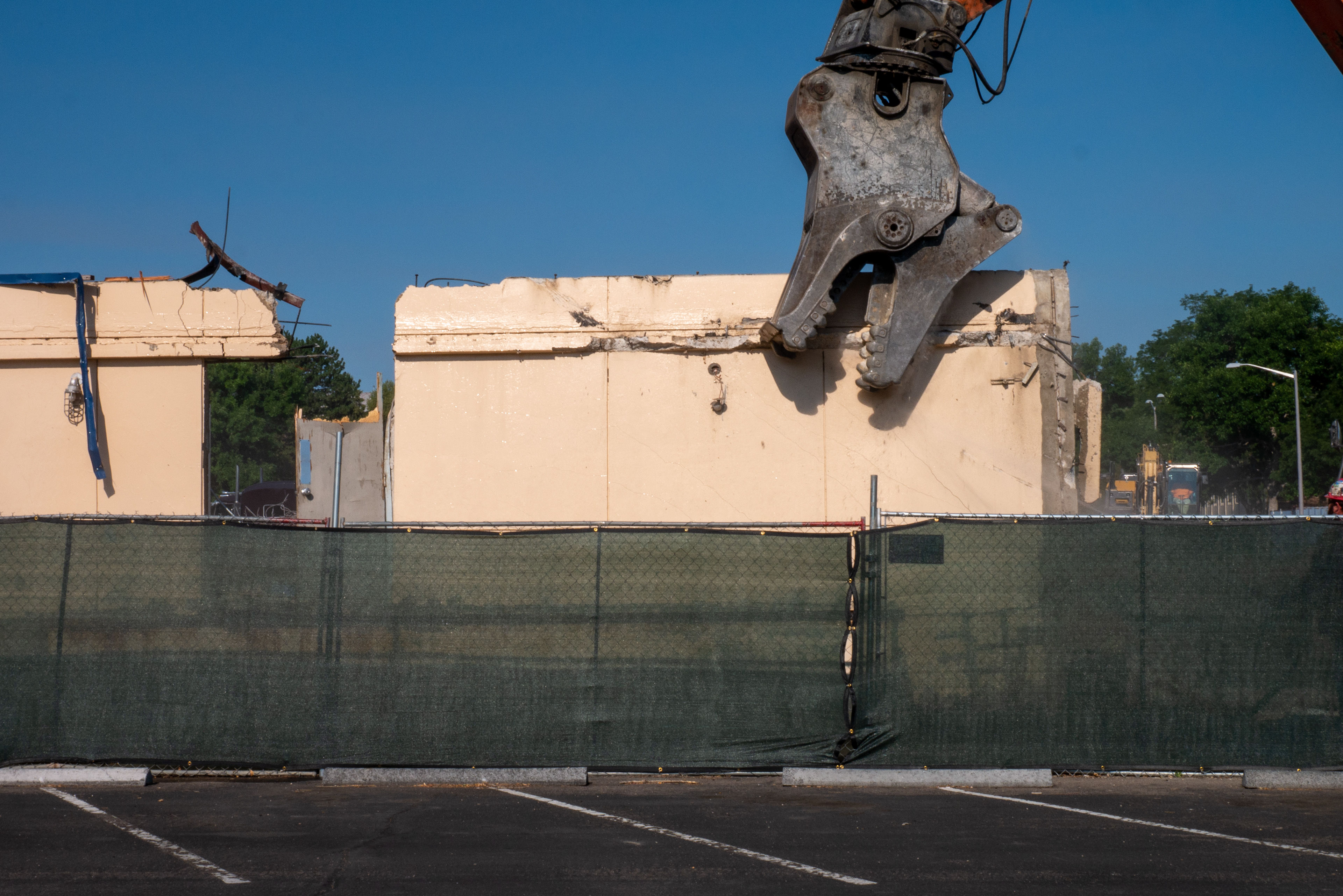 Partial removal of windows and sage green panels, south-facing side of the SE wing
